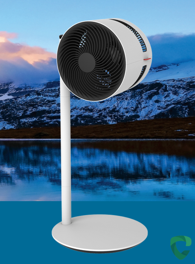 Превосходная циркуляция воздуха достигается за счет 3 основных вещей: конструкция с особым креплением стойки к головной части, обеспечивает максимальный открытый воздухозаборник, лопасти вентилятора большой ширины всасывают большое количество воздуха, а уникальная изогнутая форма передней решетки повышает скорость вращения лопастей. Головная часть вентилятора может поворачиваться на 270 градусов, поэтому ее можно направить практически в любое место.