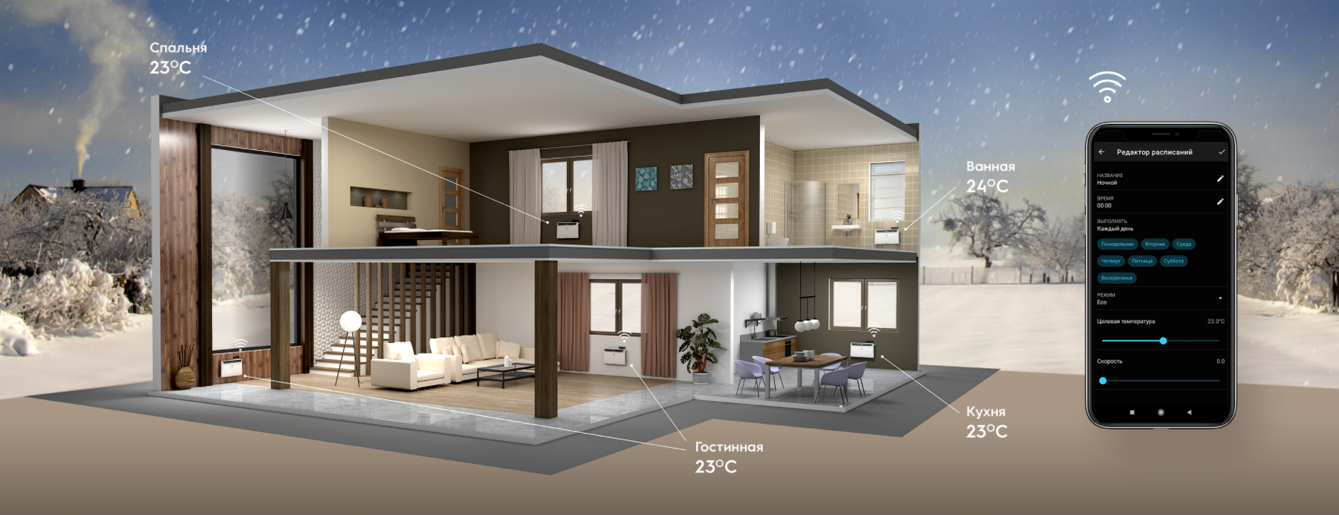 - Удобство управления через мобильное приложение: объединив конвекторы в зоны (три конвектора в гостиной — как единый прибор «гостиная») задаешь режимы работы сразу всей группе, а не отдельным конвекторам.